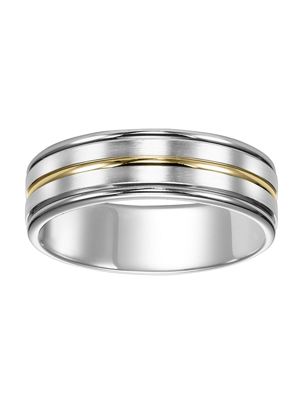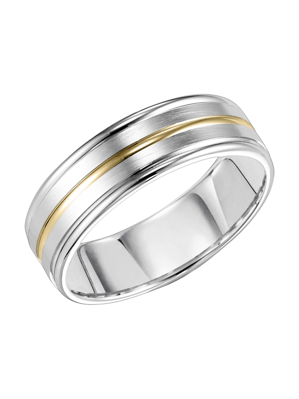 Sleek lines inspired the design of this two-tone gold, Comfort Fit wedding band enhanced with a brushed finish and round edges to complete the look Available In: 18K Yellow Gold,18K White Gold,14K Yellow Gold,14K White Gold,Platinum,Palladium