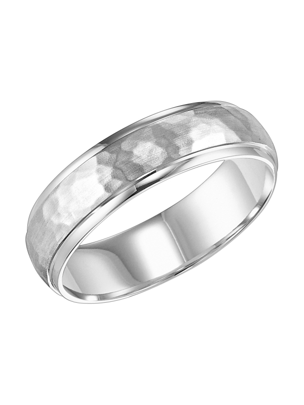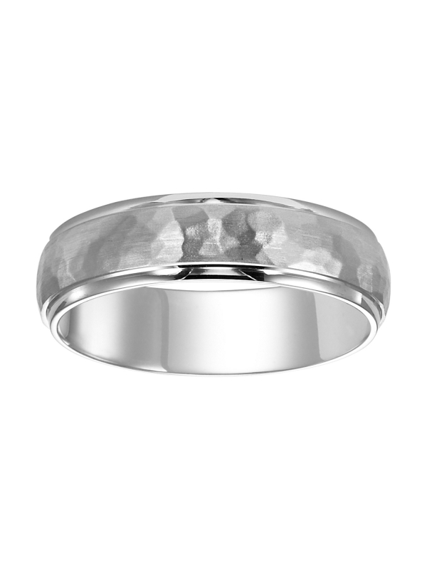 Mens wedding band with hammer satin finish and round edges with dome profile Please note hand hammered styles will have slight variations due to the nature of the manufacturing process Available In: 18K Yellow Gold,18K White Gold,14K Yellow Gold,14K White Gold,Platinum,Palladium