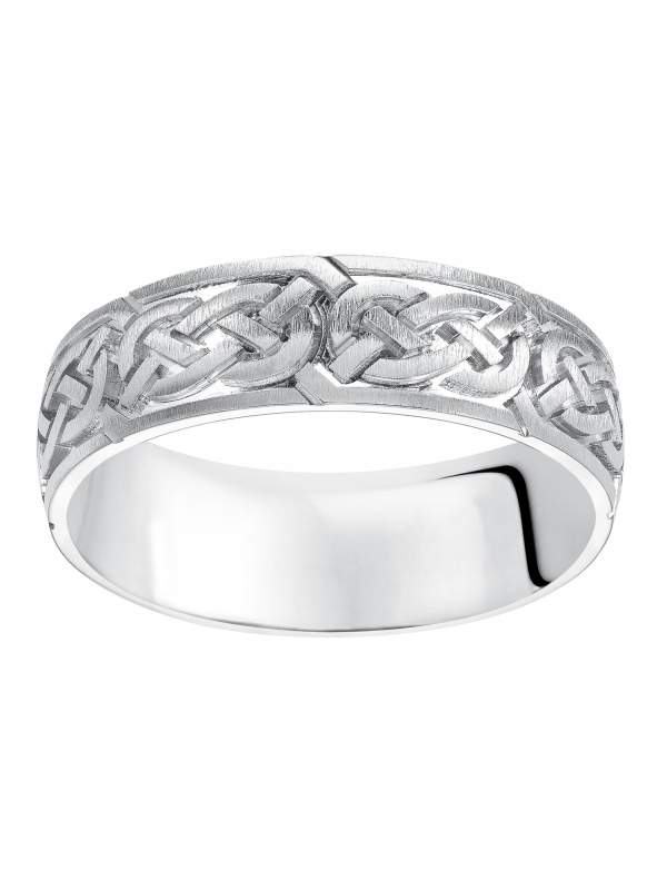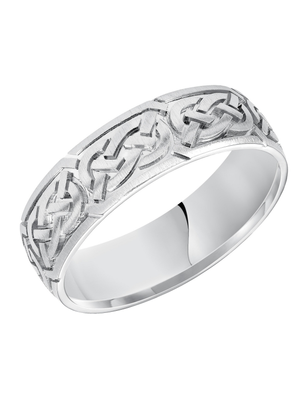 This finely crafted, Comfort Fit wedding band features an exquisite Celtic knot design, satin finish and flat edges to complete the look Available In: 18K Yellow Gold,18K White Gold,14K Yellow Gold,14K White Gold,Platinum,Palladium