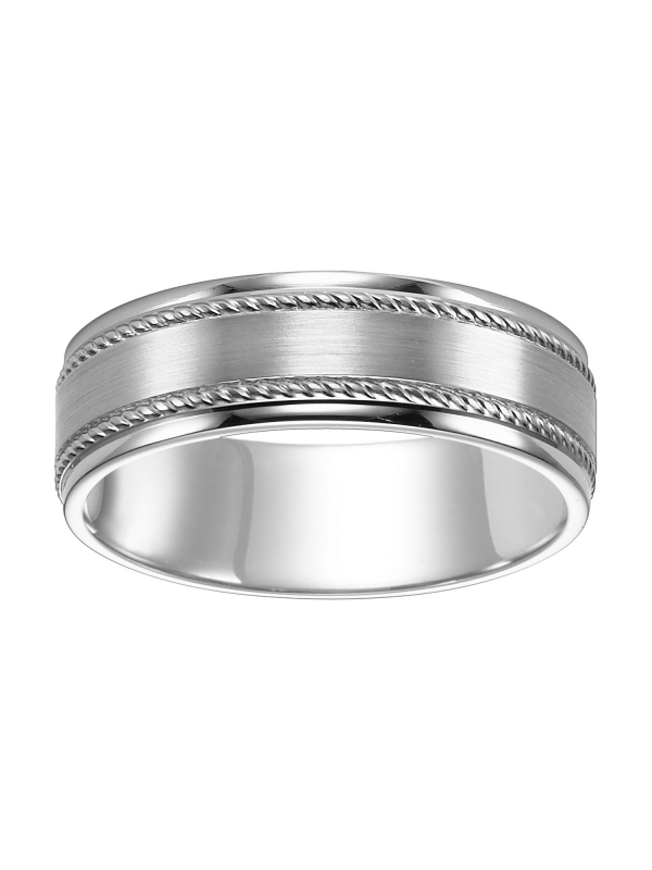 Men's wedding band with satin finish, rope accent and round edges with flat profile Available In: 18K Yellow Gold,18K White Gold,14K Yellow Gold,14K White Gold,Platinum,Palladium