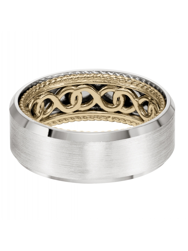 Men's Wedding Band with infinity pattern with rope edge inside and flat profile with bevel edge. Available in multiple white, yellow and rose gold color combinations. - Price does not include center stone.