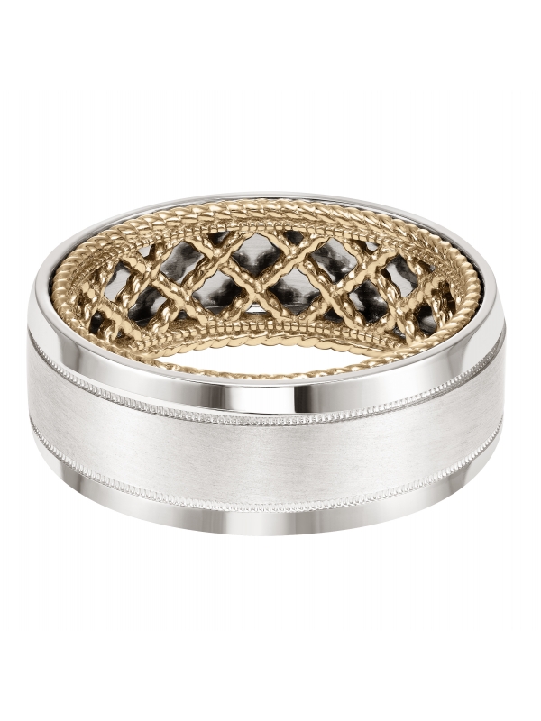 Men's Wedding Band with net pattern and rope edge inside and flat profile with milgrain detail and bevel edge. Available in multiple white, yellow and rose gold color combinations. - Price does not include center stone.