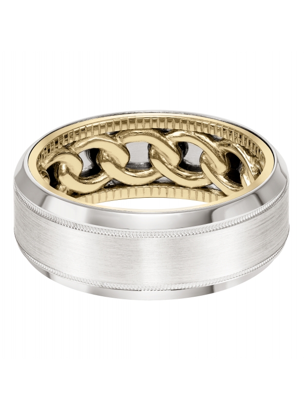 Men's Wedding Band with chain link and coin edge pattern inside and flat profile with milgrain detail and bevel edge. Available in multiple white, yellow and rose gold color combinations. - Price does not include center stone.