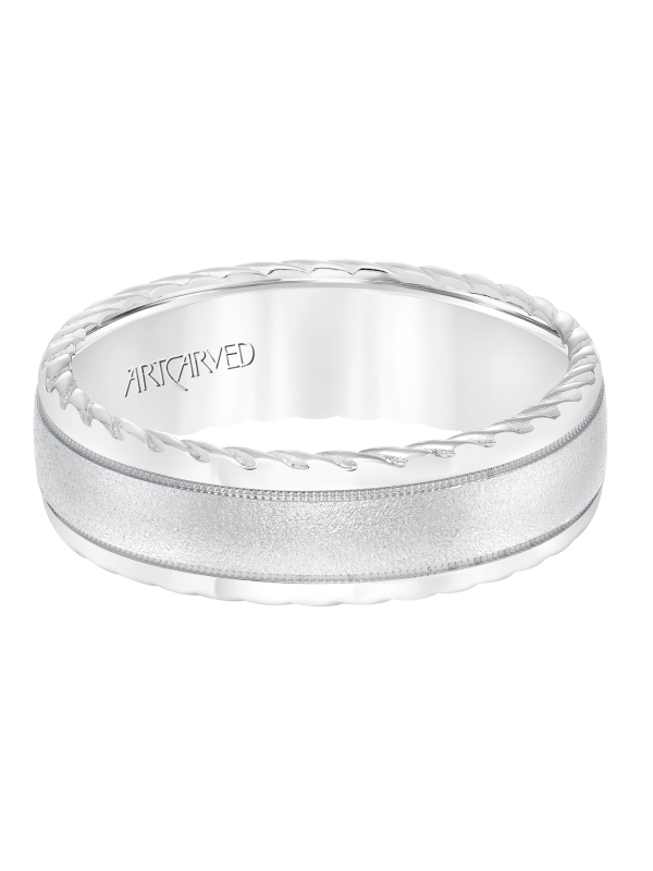 Men's wedding band with soft sand finish and round edge, rope treatment on the side with milgrain accent and low dome profile. - Price does not include center stone.