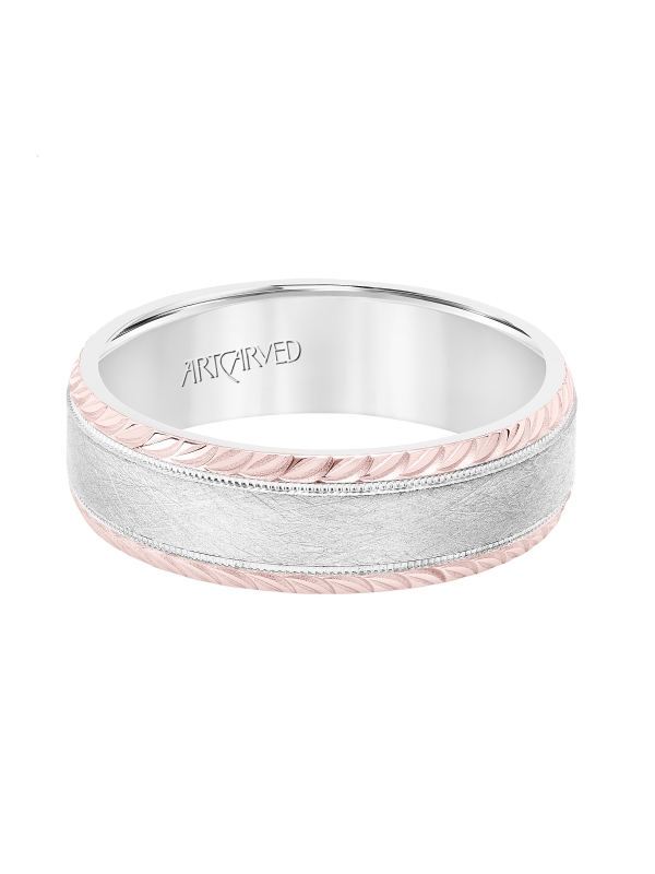 Men's Wedding Band with Domed Crystalline Finish Center with Milgrain and Leaf Design Beveled Edge - Price does not include center stone.