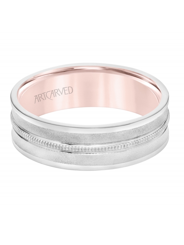Men's Comfort Fit Wedding Band with Concave Design, White Gold Exterior with Milgrain Center with Polished Flat Edge and Rose Gold Interior - Price does not include center stone.
