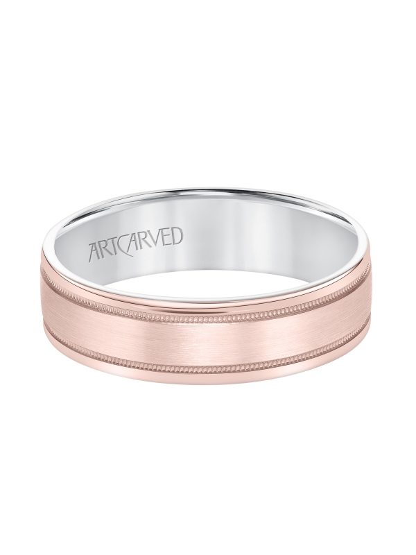 Men's Comfort Fit Wedding Band with Rose Gold Exterior with Brushed Center with Milgrain Accents and Polished Round Edge with White Gold Interior - Price does not include center stone.