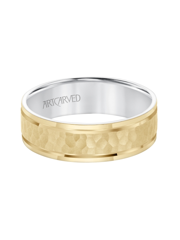 Mens Comfort Fit wed Band with Yellow Gold Exterior with brushd Finish and hammerd Texture Center with Polished Flat Edge and White Gold Interior Pls note hand hammerd styles will have slight variations due to the nature of the manufacturing process - Price does not include center stone.