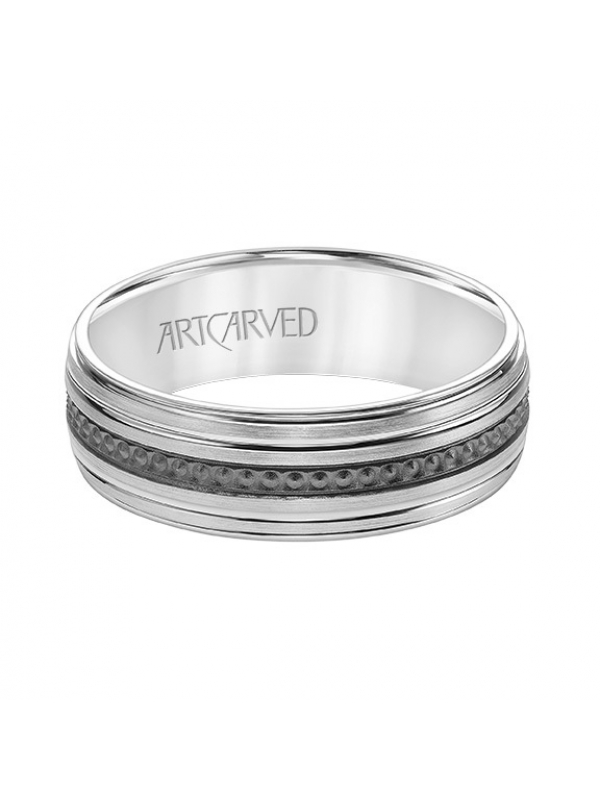 Mens Comfort Fit Wedding Band with Brushed Finish with Textured Black Rhodium and Polished Lines and Polished Round Edge - Price does not include center stone.