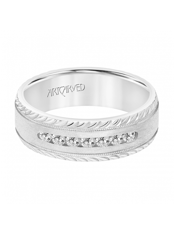 Men's Wedding Band with Flat Crystalline Finish Center with Channel Set Diamonds with Milgrain and Leaf Design Beveled Edge. - Price does not include center stone.