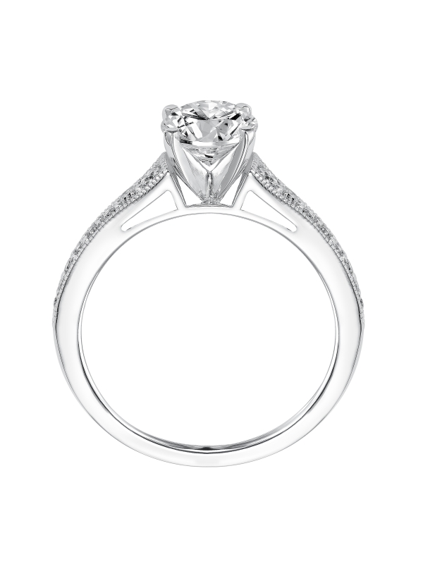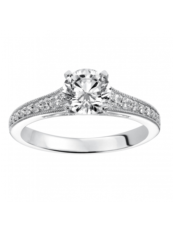 This engagement ring features a round center stone and graduating prong set diamond band with milgrain for alluring heirloom style Center stone not included.