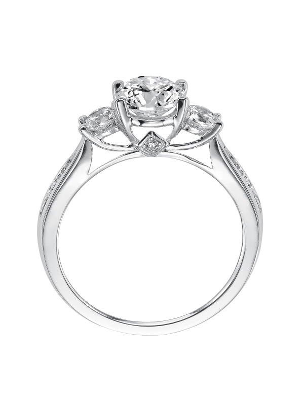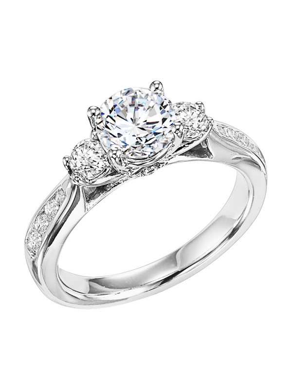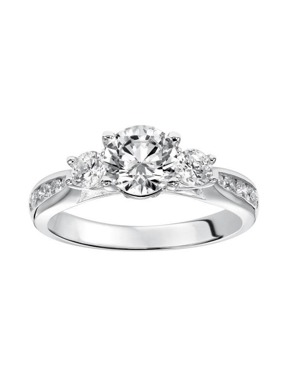 3-stone prong set diamond engagement ring gleams with its graduated diamond channel set band Center stone not included.