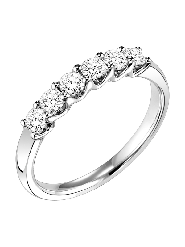Wedding band with six, shared prong set, round diamonds and high polished shank.