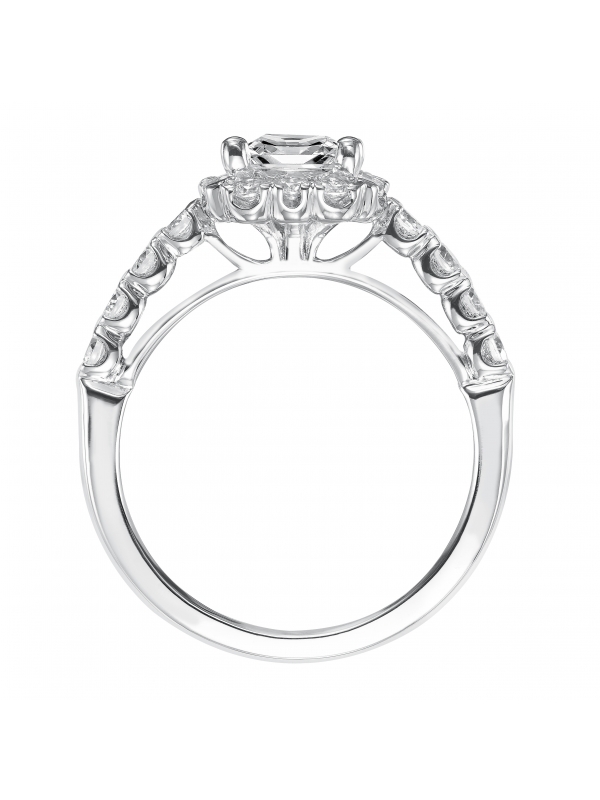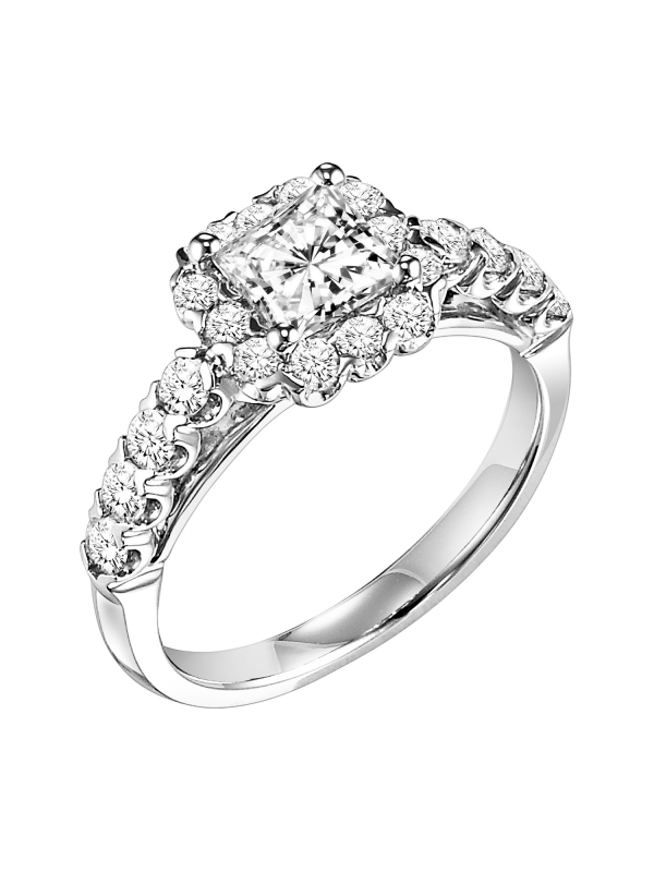 Engagement ring features an oval cut diamond accentuated by an exquisitely set diamond shared prong halo and band for maximum sparkle Center stone not included.