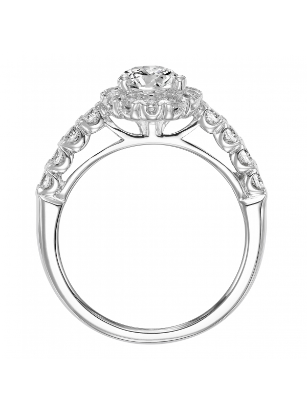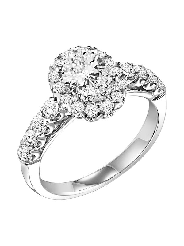 Engagement ring features an emerald cut diamond accentuated by an exquisitely set diamond shared prong halo and band for maximum sparkle Center stone not included.