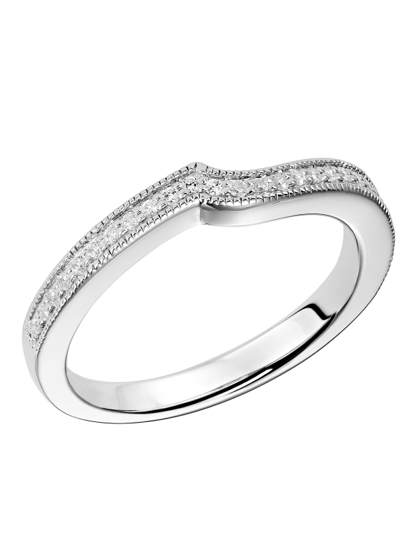 Wedding band with round diamonds and milgrain designed to fit flush with matching engagement ring.