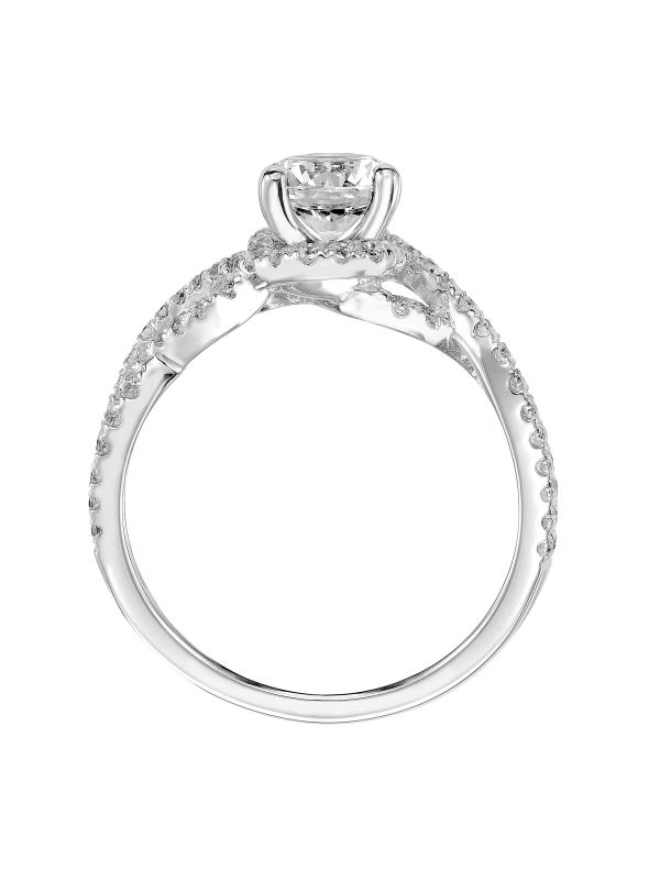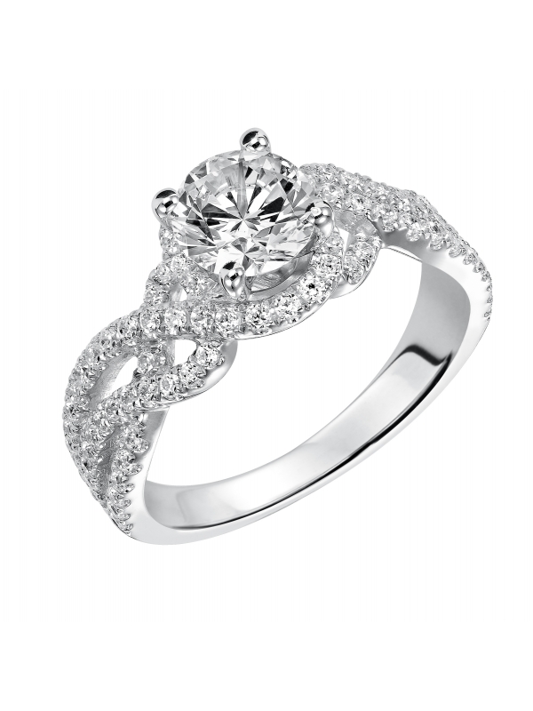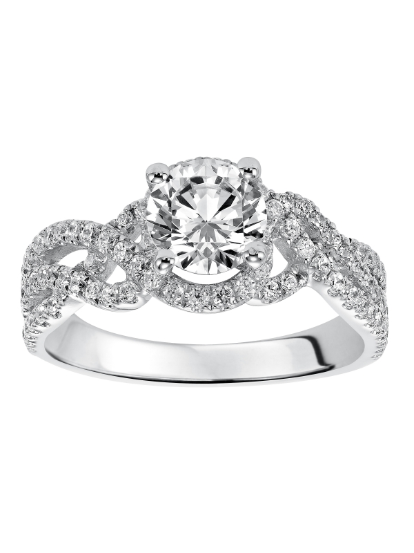 Shimmer and sparkle with this modern woven free form engagement ring featuring prong set diamonds gracing the band Center stone not included.