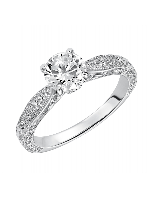 Absolutely exquisite with its intricate design, this round diamond engagement ring features a diamond prong set band with a gorgeous engraved design with milgrain details Center stone not included.