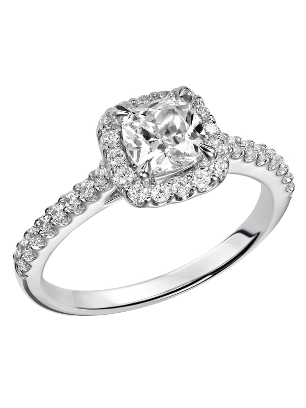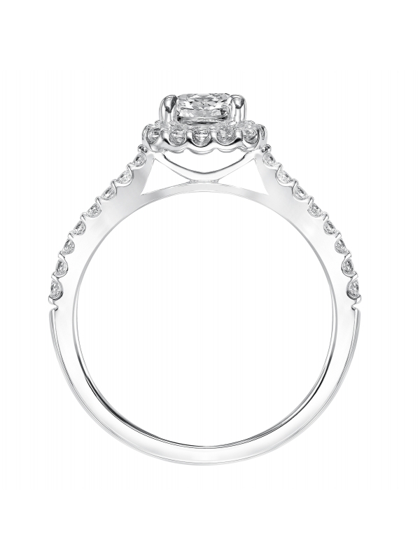 This timeless engagement ring features a diamond exquisitely enhanced with a prong set diamond halo and band Center stone not included.