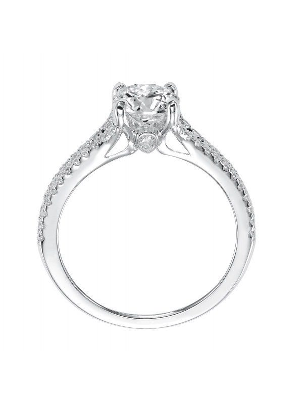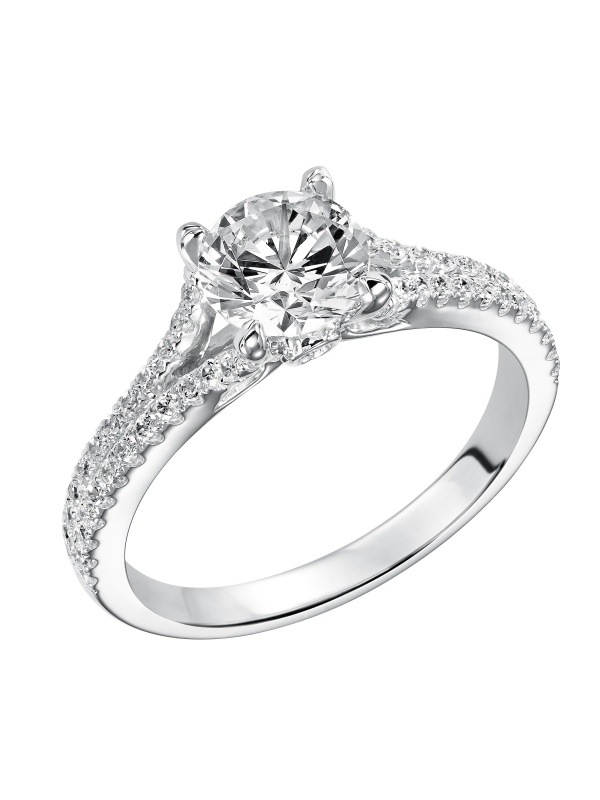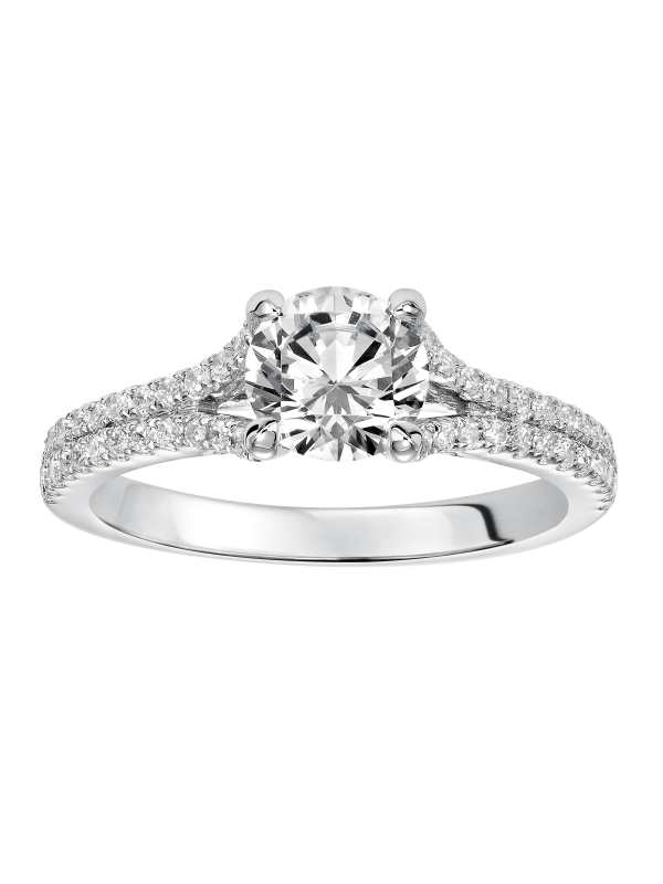 This distinguished prong set engagement ring features a round diamond center stone accentuated by a delicate, diamond prong set split band Center stone not included.