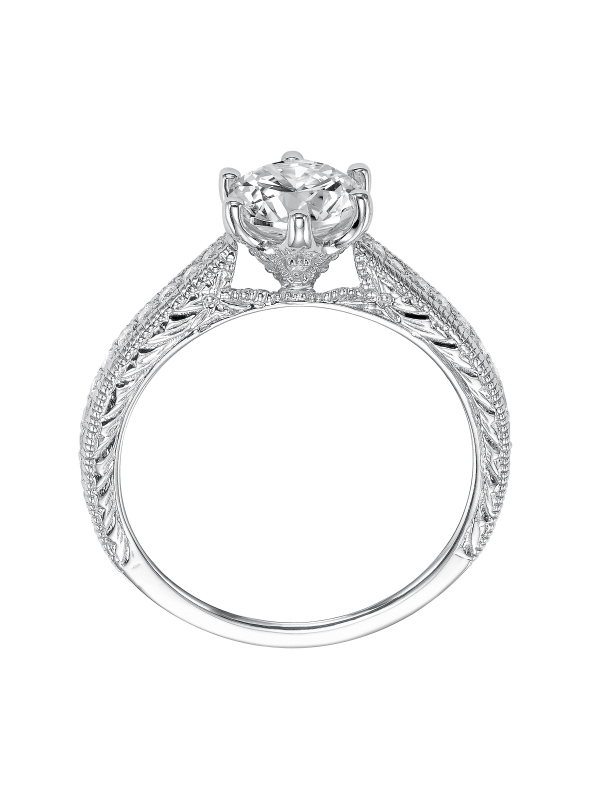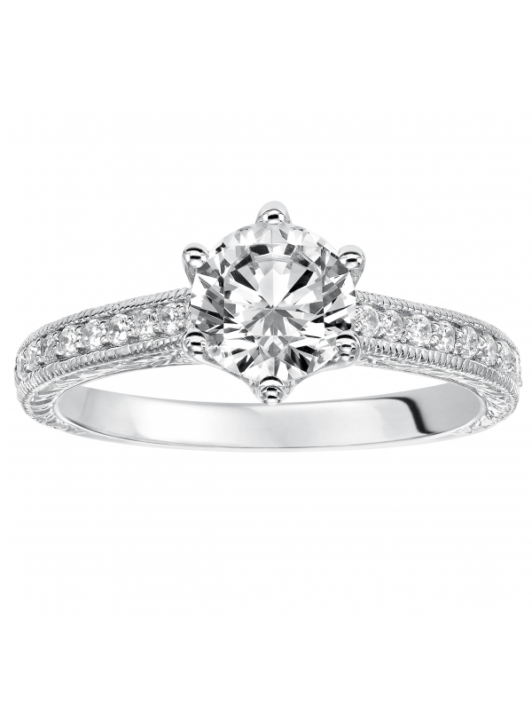 Accentuated with a six prong setting, this round diamond engagement ring features a magnificent diamond prong set engraved band with milgrain Center stone not included.