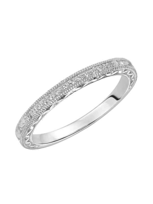 Wedding band with bead set, round diamonds, engraving and milgrain.