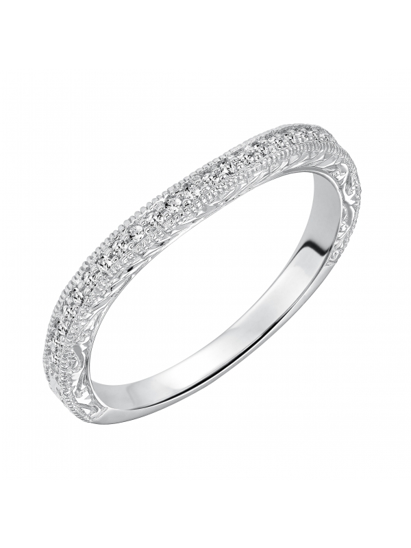 Wedding band with bead set, round diamonds, milgrain and engraved with curved design to fit flush with matching engagement ring.