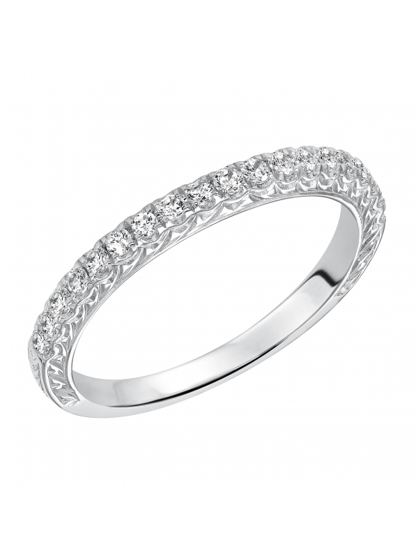 Wedding band with shared prong set, round diamonds and engraved design.