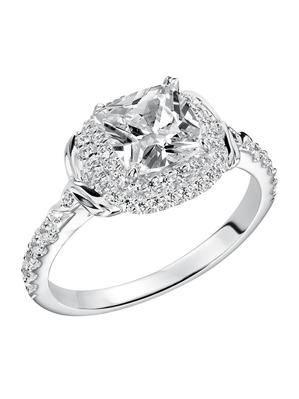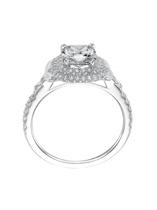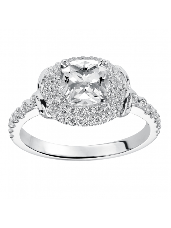 This cushion cut engagement ring is a show-stopper with its two-row diamond prong set halo, high polished accents and delicate prong set diamond band Center stone not included.