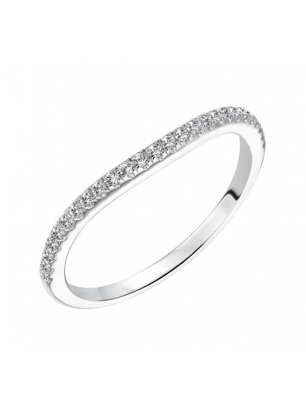 Wedding band with pave set, round diamonds and curved to fit flush with matching engagement ring.