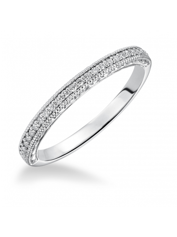 Wedding band with bead set, round diamonds, engraving and milgrain.