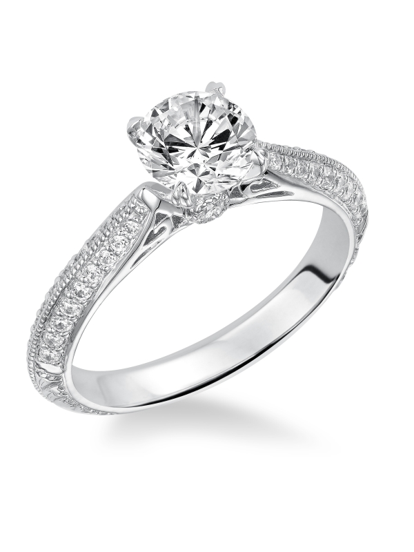 Graceful and elegant, this diamond engagement ring features a delicate diamond prong set band with milgrain details and engraving Center stone not included.