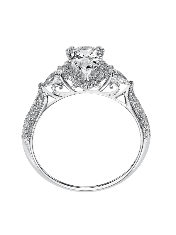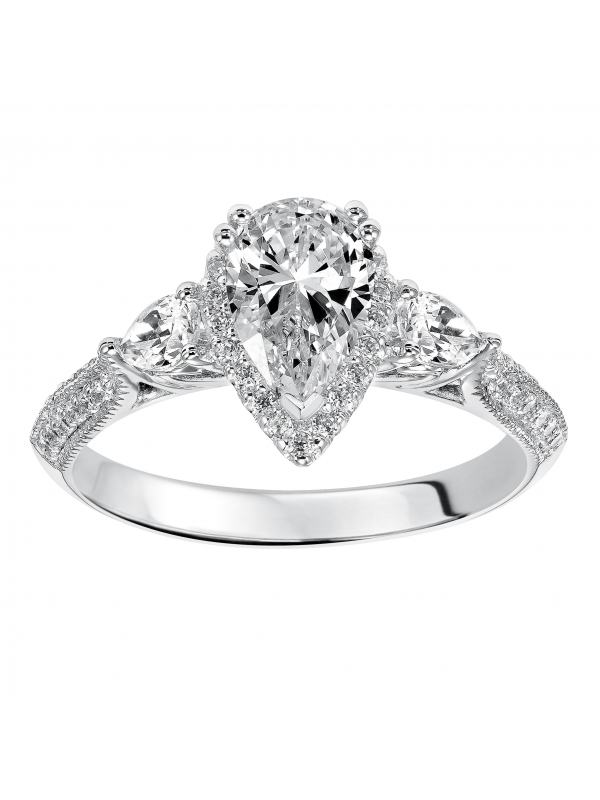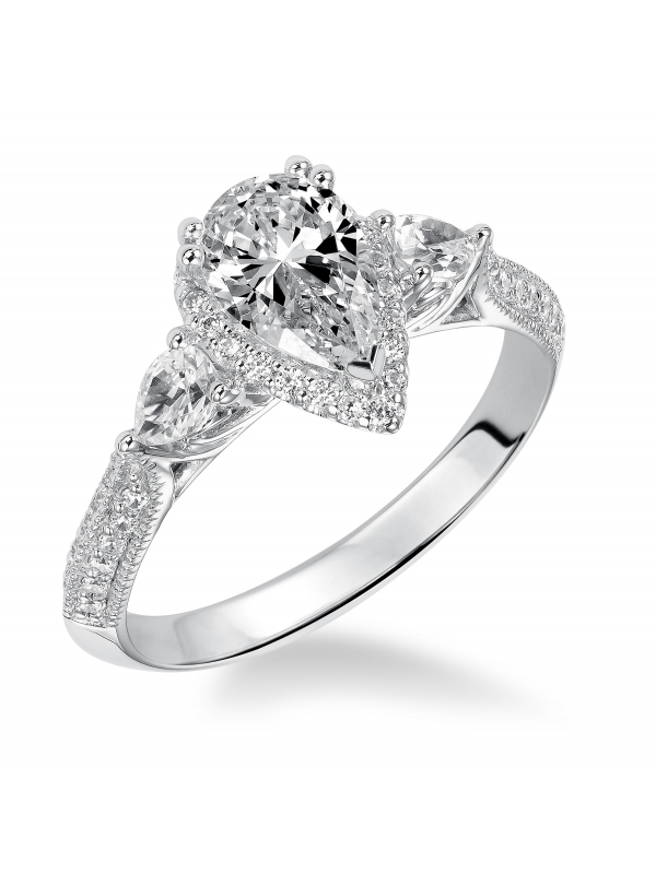 Old Hollywood glamour is infused into the design of this 3-stone pear cut diamond engagement ring with prong set diamonds and milgrain gracing the band Center stone not included.