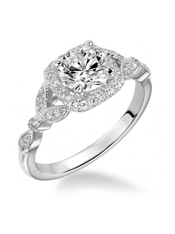 This whimsically styled engagement ring sparkles with its filigree and diamond halo and diamond prong set floral-inspired band Center stone not included.