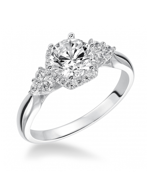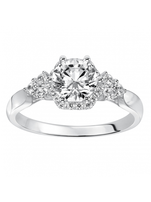 This engagement ring dazzles with a hexagon-inspired halo with filigree and diamond clusters gracing a high polished band for a contemporary chic look Center stone not included.