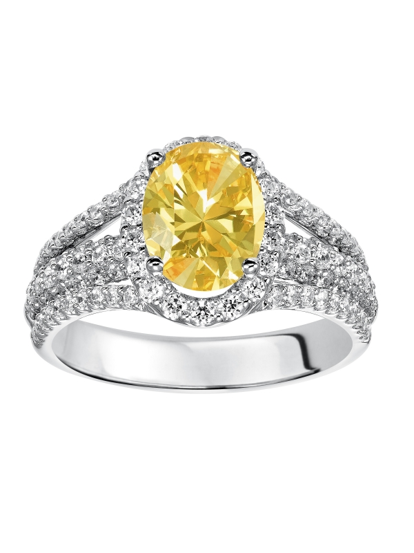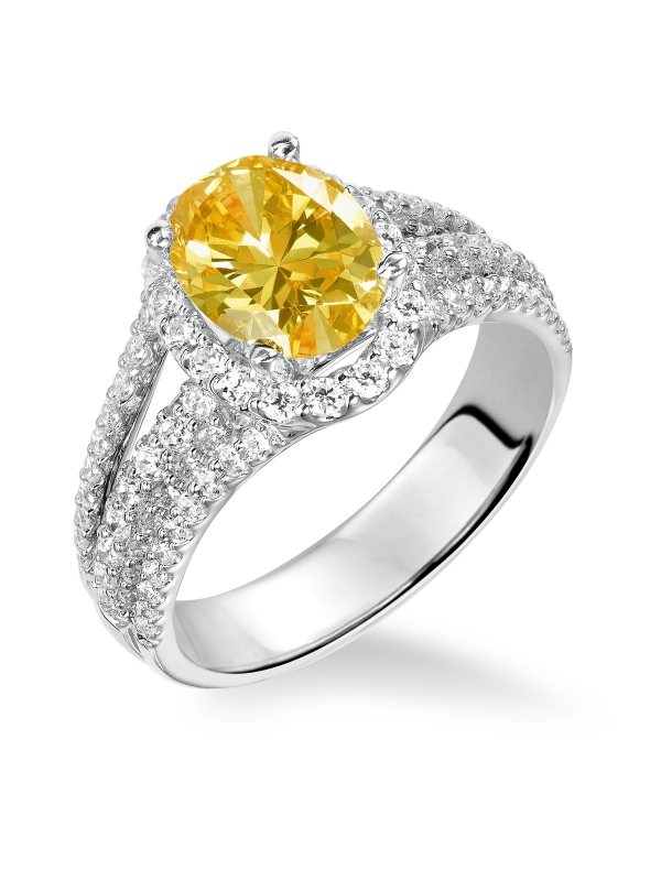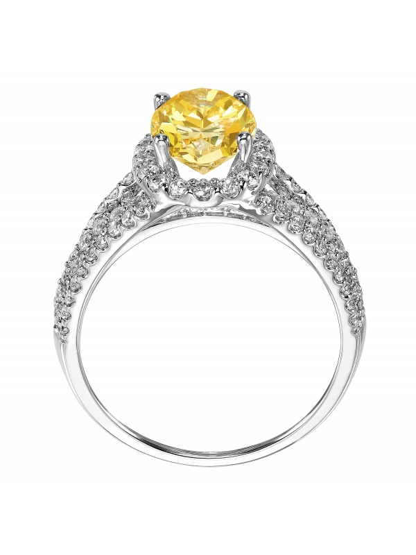 Diamond engagement ring with prong set round diamond halo and multi-row prong set diamond shank. Center stone not included.