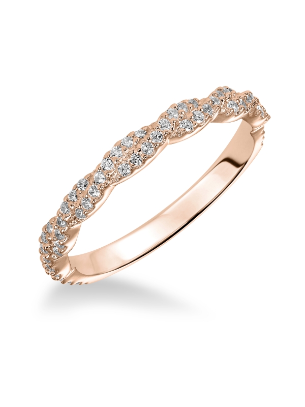 Wedding band with prong set, round diamonds and delicate twisted shank design.