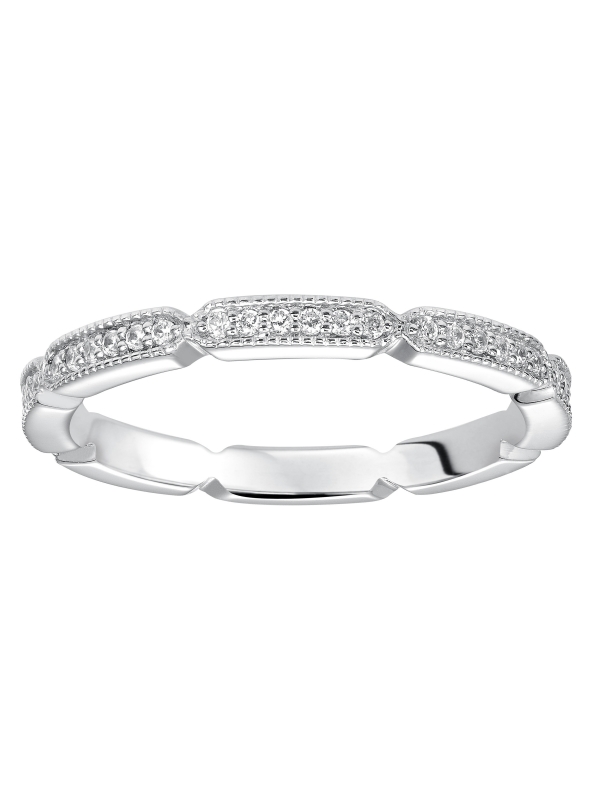 Wedding band featuring a geometric-inspired design with round diamonds and milgrain.