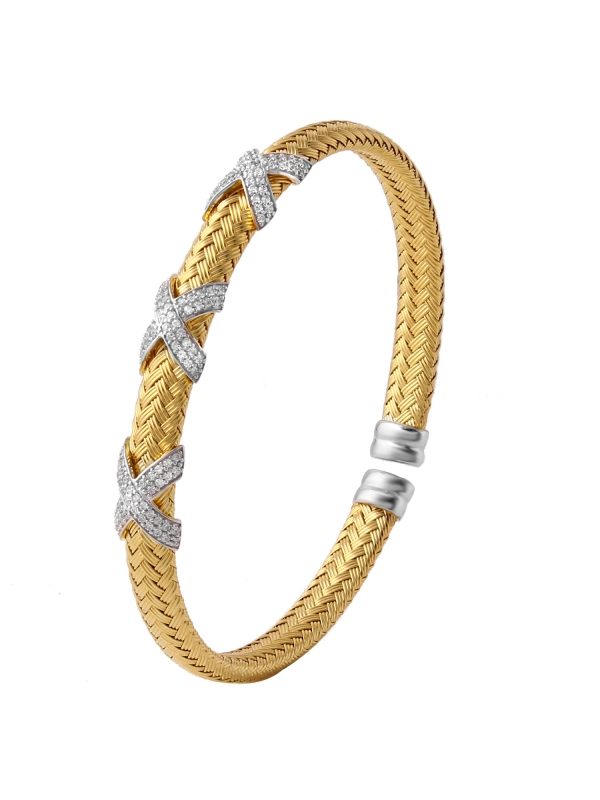 925 SS 6MM WOVEN TRIPLE X CZ STATION CUFF 18K YG AND RHODIUM FINISH
