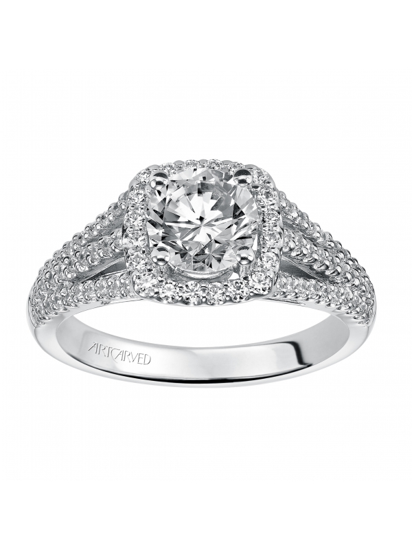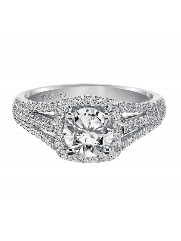 Diamond engagement ring with round center stone, round diamonds surrounding the center stone, and three rows of prong set diamonds in the band Available In: Diamond,18K Yellow Gold,18K White Gold,14K Yellow Gold,14K White Gold,Platinum,Palladium - Price does not include center stone.