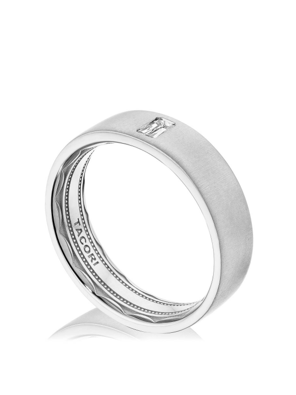 A satin exterior is accented with a Tacori-exclusive triple-cut diamond, bezel-set into the flat-top band. This simple but elegant design is complemented by full sculpted crescent detail and a soft-comfort fit interior.