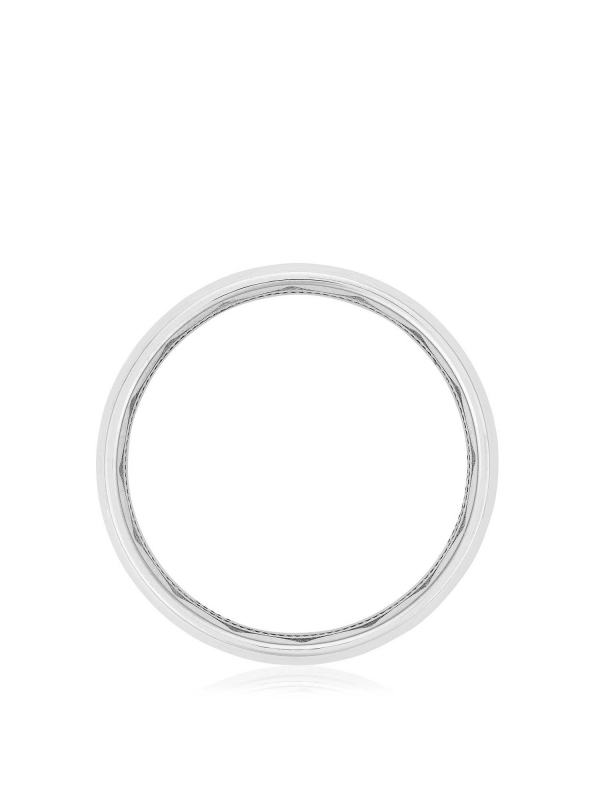 The high polish, softly-rounded exterior of this wedding band is encircled with eye-catching and expertly channel-set black diamonds. The inner face of the ring boasts a full sculpted crescent detail with a soft-comfort fit for all-day wearability.