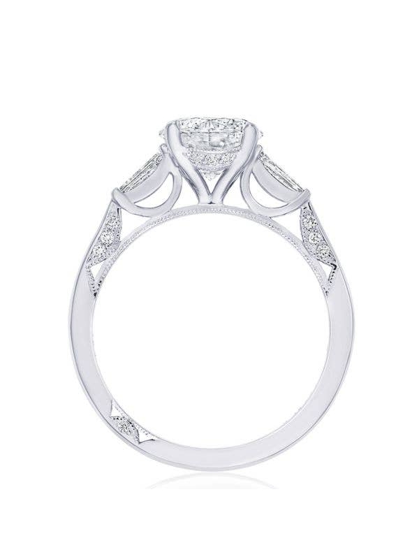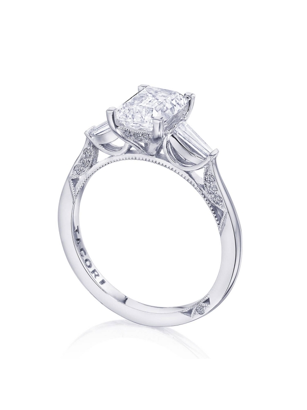 Let your diamond engagement ring stand out by contrasting your side stones with your center diamond Baguette side stones graduate to the emerald center, bringing a magical contrast to bring about beauty from every angle.