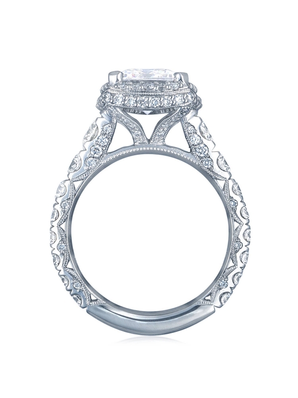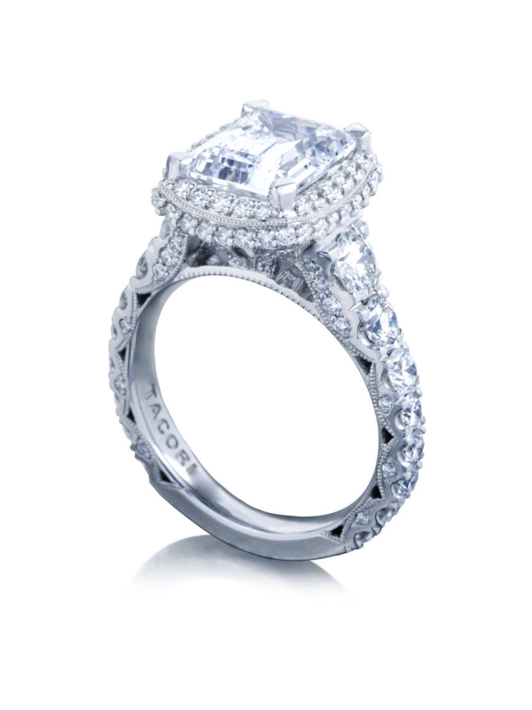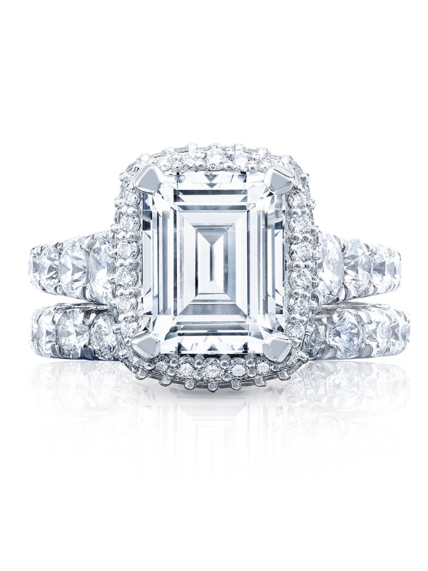 Graduating diamonds lead up the ceiling to an emerald-bloomed center stone. An open gallery beneath the crown highlights the diamond, while Petite Crescent fabric adds intricate diamond and milgrain detailing.