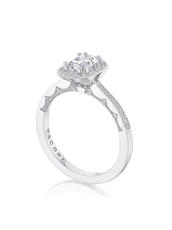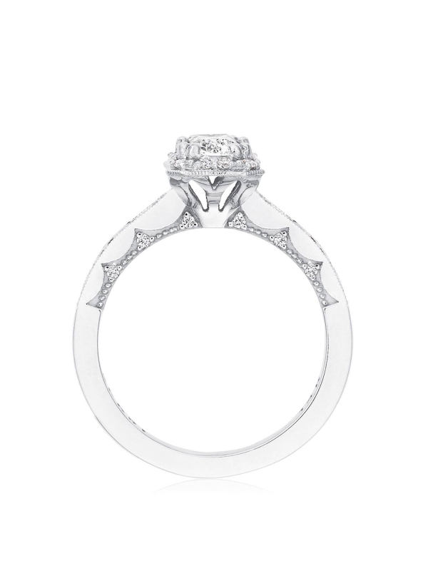 Round-brilliant diamonds decorate the ceiling and bloom around the center stone, for an even and ethereal sparkle. Coastal Crescent fabric with pinpoint diamond detailing adds a clean texture to the innerface.