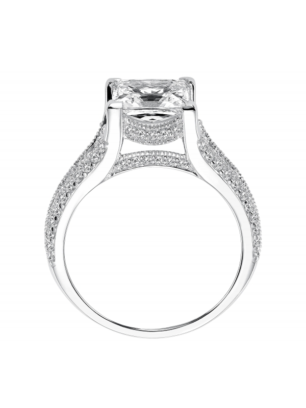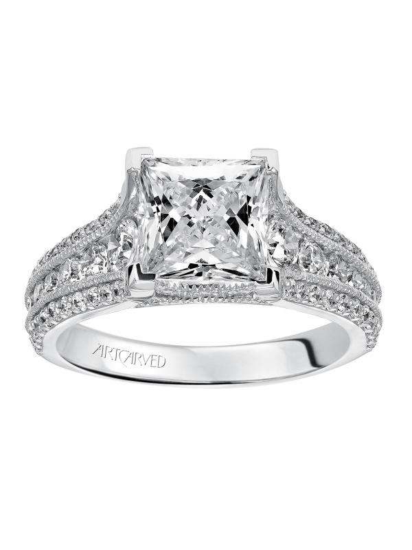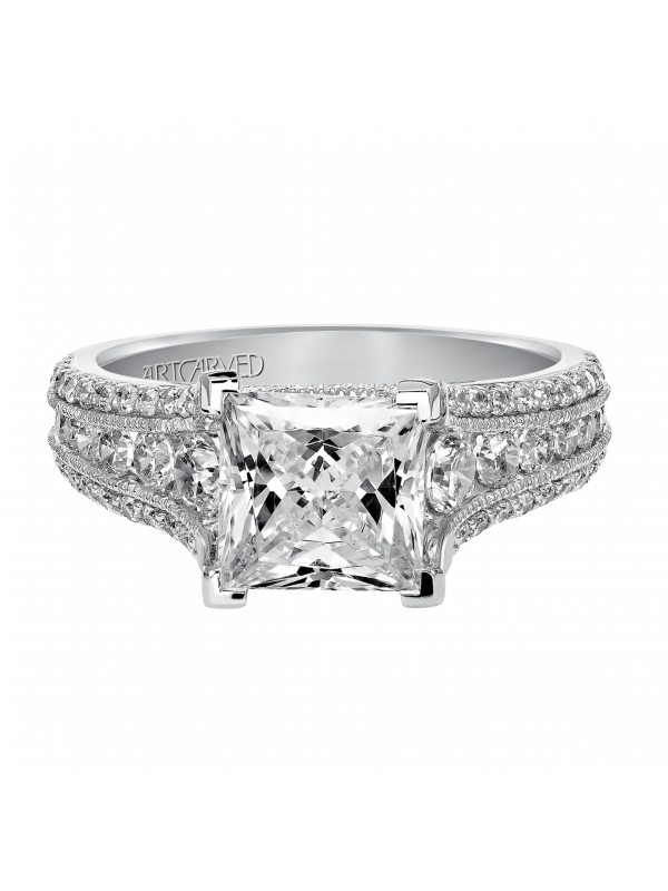 Estate diamond engagement ring features channel set graduated round diamonds with milgrain detail and prong set diamonds on the shank Milgrain detail is also feature under the center stone Available In: Platinum,Palladium - Price does not include center stone.