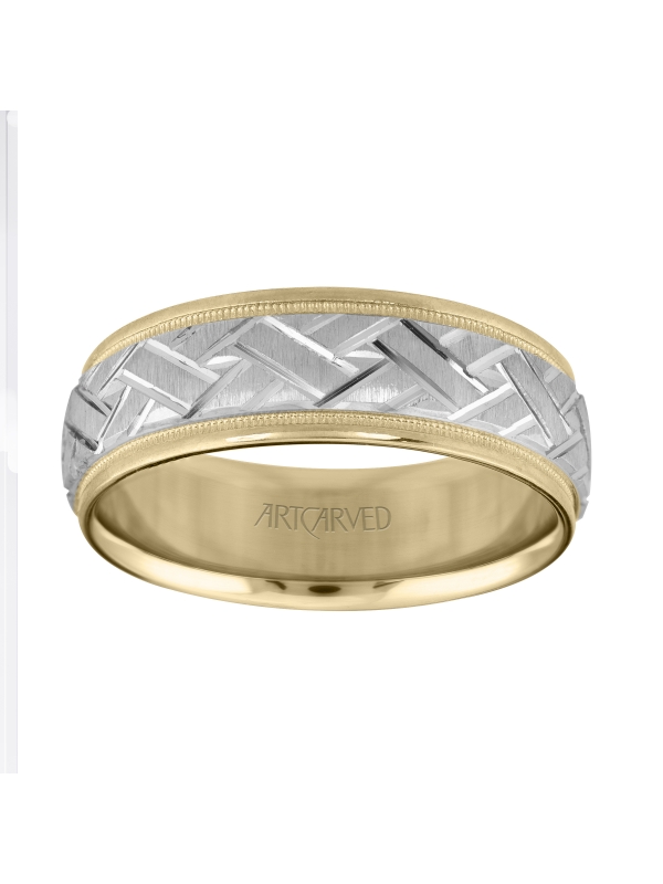 Comfort Fit wedding band with engraved design on a white insert, and yellow rolled edges with milgrain finish - Price does not include center stone.
