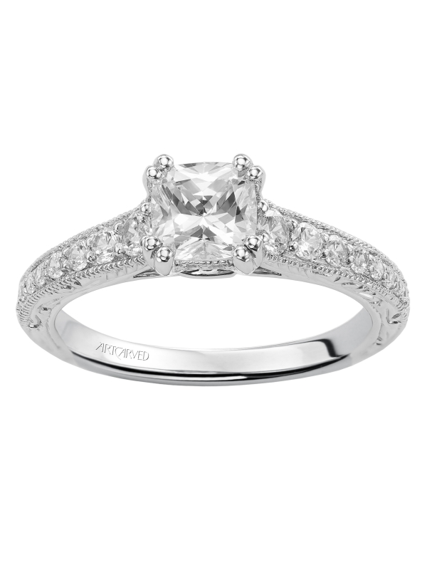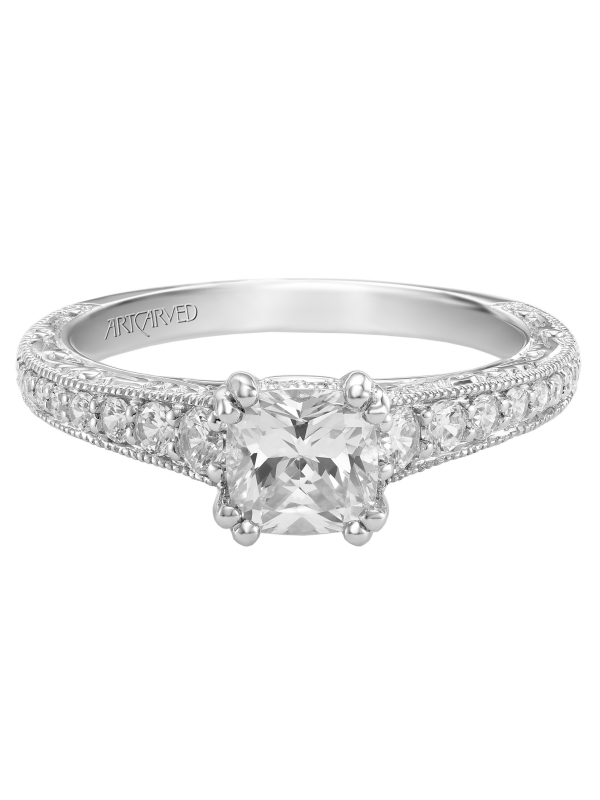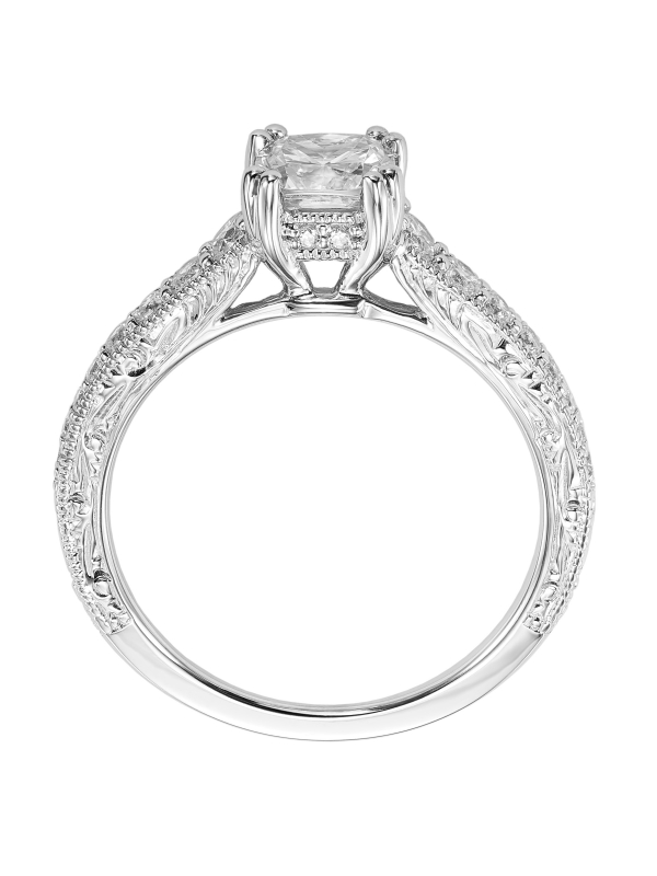 Cushion cut engraved engagement ring with diamond band Available In: 18K Yellow Gold,18K White Gold,14K Yellow Gold,14K White Gold,Rose Gold,Platinum,Palladium - Price does not include center stone.