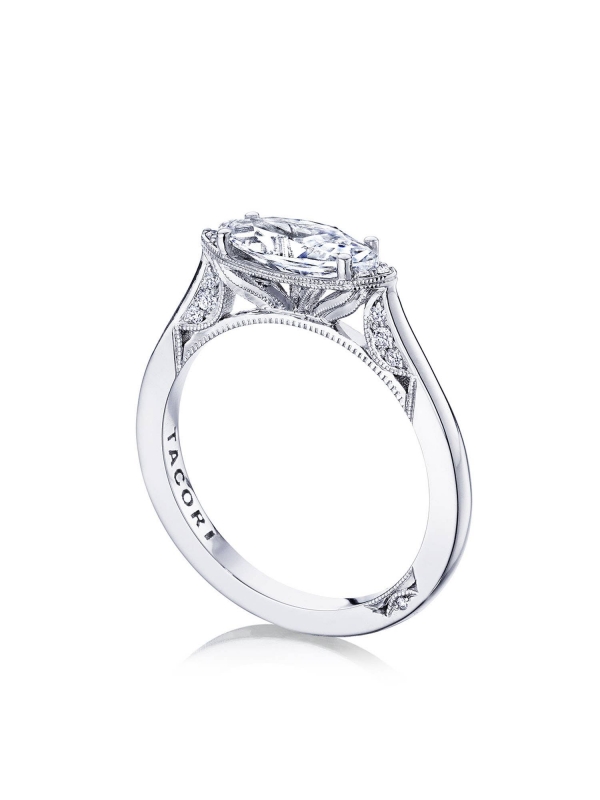 Broaden your horizons Modern and unexpected, your marquise center is flipped in a horizontal orientation along the axis of your Tacori ring. Accentuated by a diamond tipped frame that spotlights the elongated elegance of your marquise center, this new Tacori style can be worn as a contemporary engagement ring or worn as a fashionable stacking right hand ring.