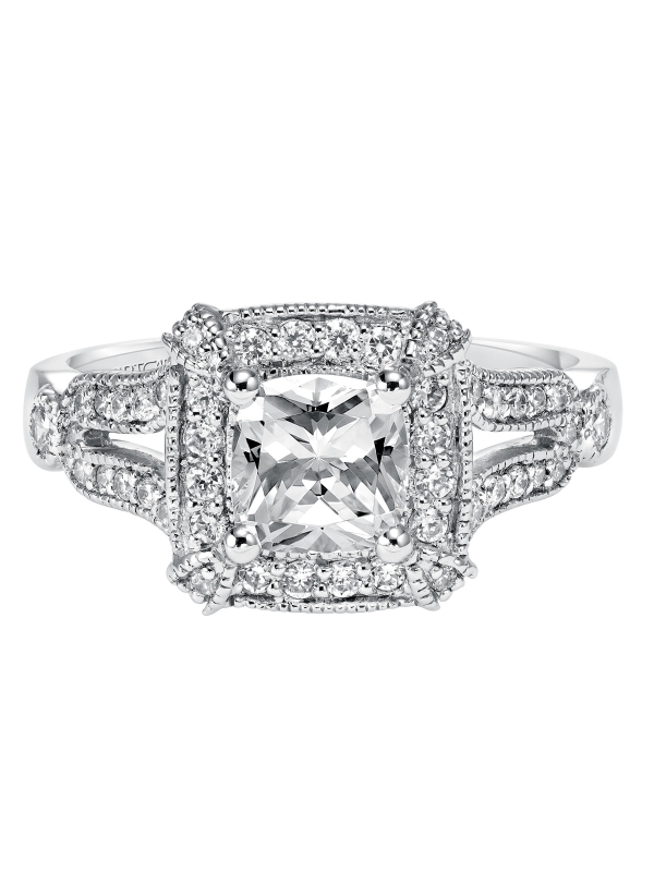 Diamond engagement ring featuring a diamond halo, claw prongs and open shank design with milgrain Available In: 14K White Gold,Platinum,Palladium - Price does not include center stone.
